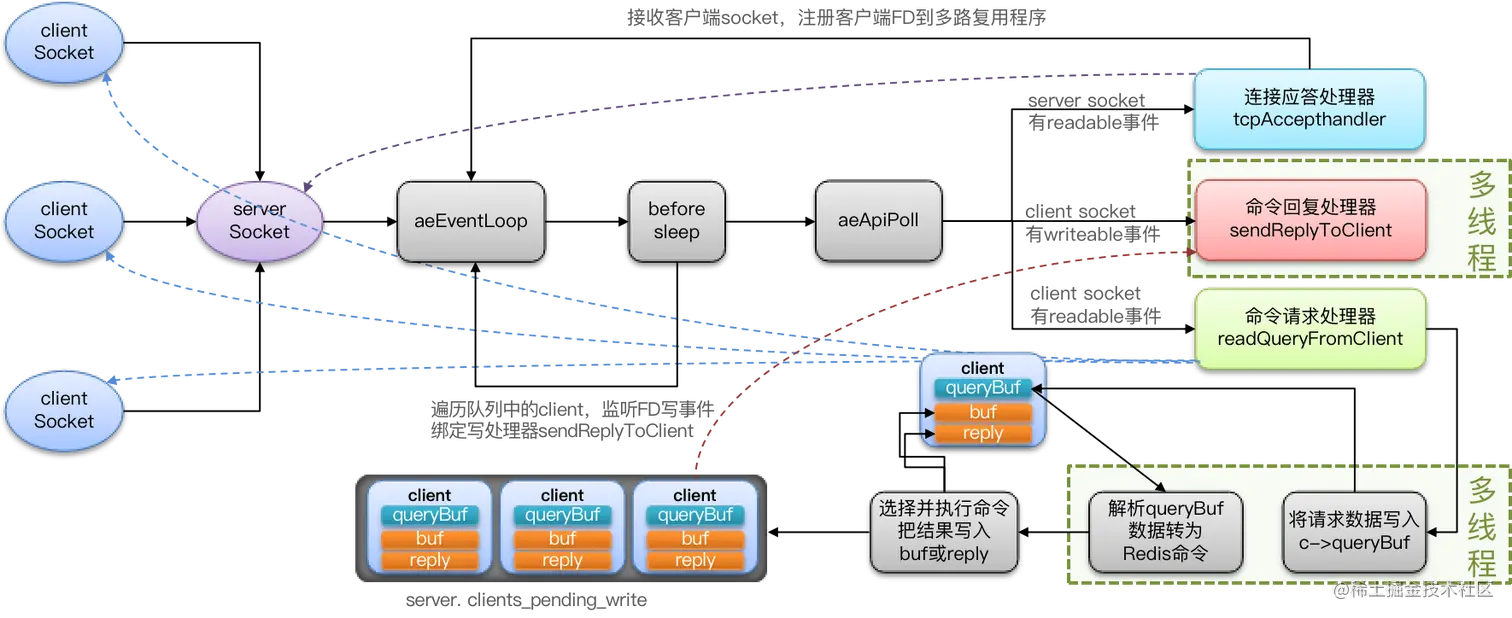 - 当客户端Socket可读的时候又会绑定一个处理器---readQueryFormClient。readQueryFormClient函数里面首先他要先给每个客户端封装一个对应的client,client里面封装一个queryBuf,代表查询缓冲区,接下来他会把请求读一下放到querybuf里。然后解析queryBuf数据为Redis命令。接下来就开始处理这些命令,从redis中的command中找到这些命令,然后就真正的去操作对应的数据了,当数据操作完成后,会把数据写到输出缓冲区中(buf或者reply,buf类似于一个数据,reply是一个链表,当buf写不下时就会写到reply中去)此时已经写到客户端缓冲区了,还没有写到客户端。这个时候会创建一个队列(server. clients_pending_write),存放那些被写的客户端。这个时候readQueryFormClient这个处理器就结束了。