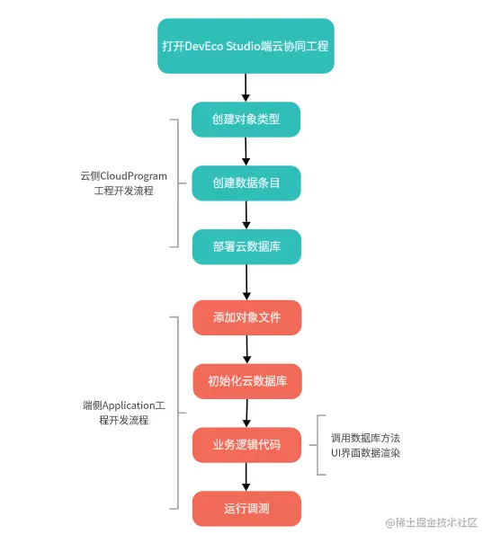 DevEco Studio 3.1 Beta1提供了端云协同开发,可以通过云侧CloudProgram项目创建云数据库对象类型、存储区、配置权限,端侧引入相关的云数据库文件即可进行云数据库数据操作,应用开发流程如下图所示: