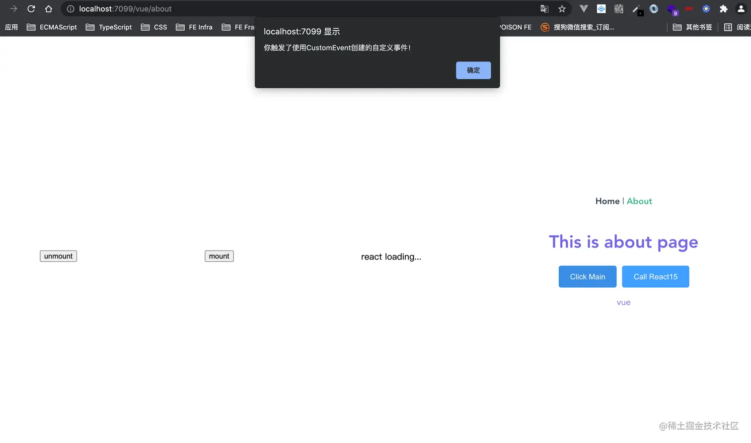 alert("你触发了使用CustomEvent创建的自定义事件!React15");