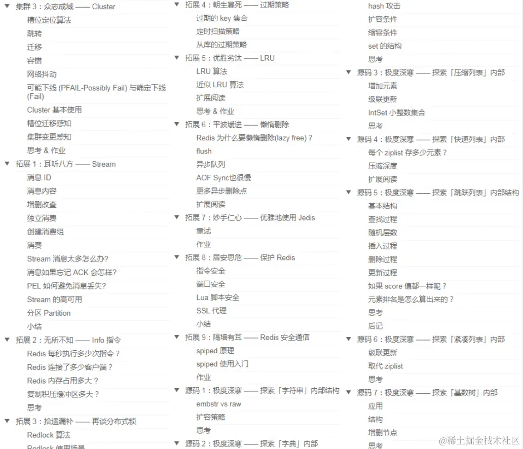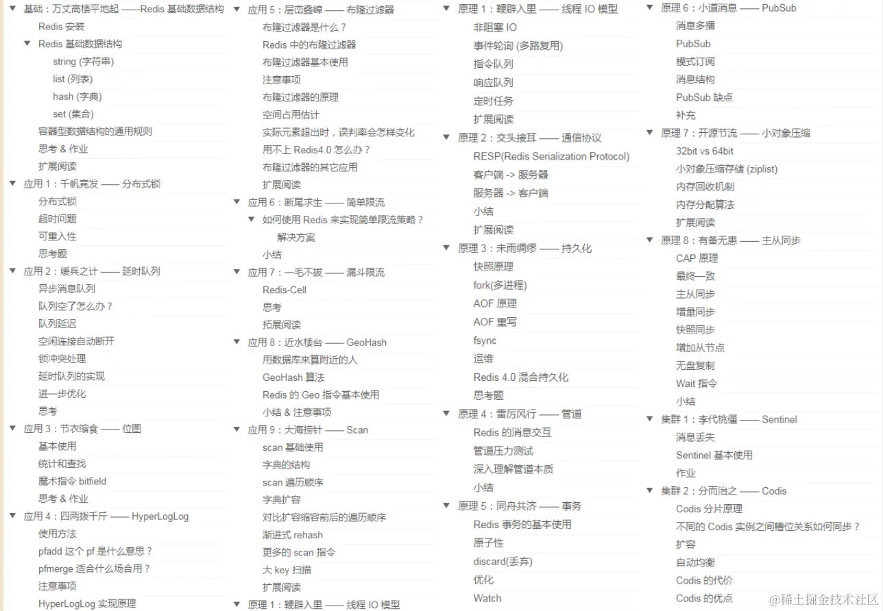 所谓「授人以鱼不如授人以渔」,在这里小编要给大家分享一份圈内最全的看到就是赚到的Redis笔记,目的就是为了帮助后端开发者较为深入的 理解 Redis 背后的原理和实践经验,做到知其然也知其所以然,为未来进阶成长为架构师做好准备。话不多说下面是目录和部分内容截图