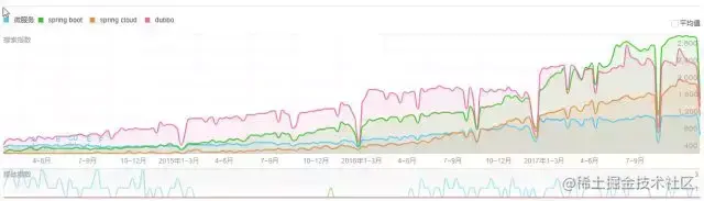 首先给大家看一张百度指数上,关于微服务、Spring Boot、Spring Cloud、Dubbo的趋势图: