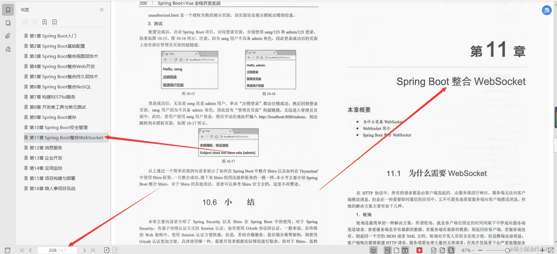 第11章Spring Boot整合WebSocket, 本章主要向读者介绍了Spring Boot整合WebSocket,整体来说,经过Spring Boot自动化配置之后的WebSocket使用起来还是非常方便的。通过@MessageMapping 注解配置消息接口,通过@SendTo或者SimpMessagingTemplate进行消息转发,通过简单的几行配置,就能实现点对点、点对面的消息发送。在企业信息管理系统中,一般即时通信、通告发布等功能都会用到WebSocket。