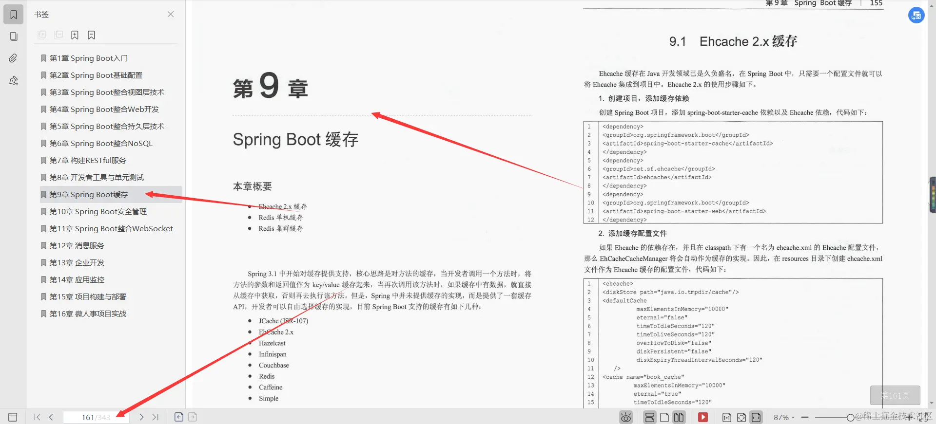 第9章Spring Boot缓存, 本章向读者介绍了两种常见的缓存技术Ehcache和Redis,其中 Redis又分为单机缓存和集群缓存。Ehcache部署简单,使用门槛较低,操作简便,但是功能较少,可扩展性较弱;Redis则需要单独部署服务器,单机版的Redis缓存基本上做到了开箱即用,集群版的Redis缓存虽然配置烦琐,但是具有良好的扩展性与安全性,开发者在开发中可根据实际情况选择不同的缓存实现策略。