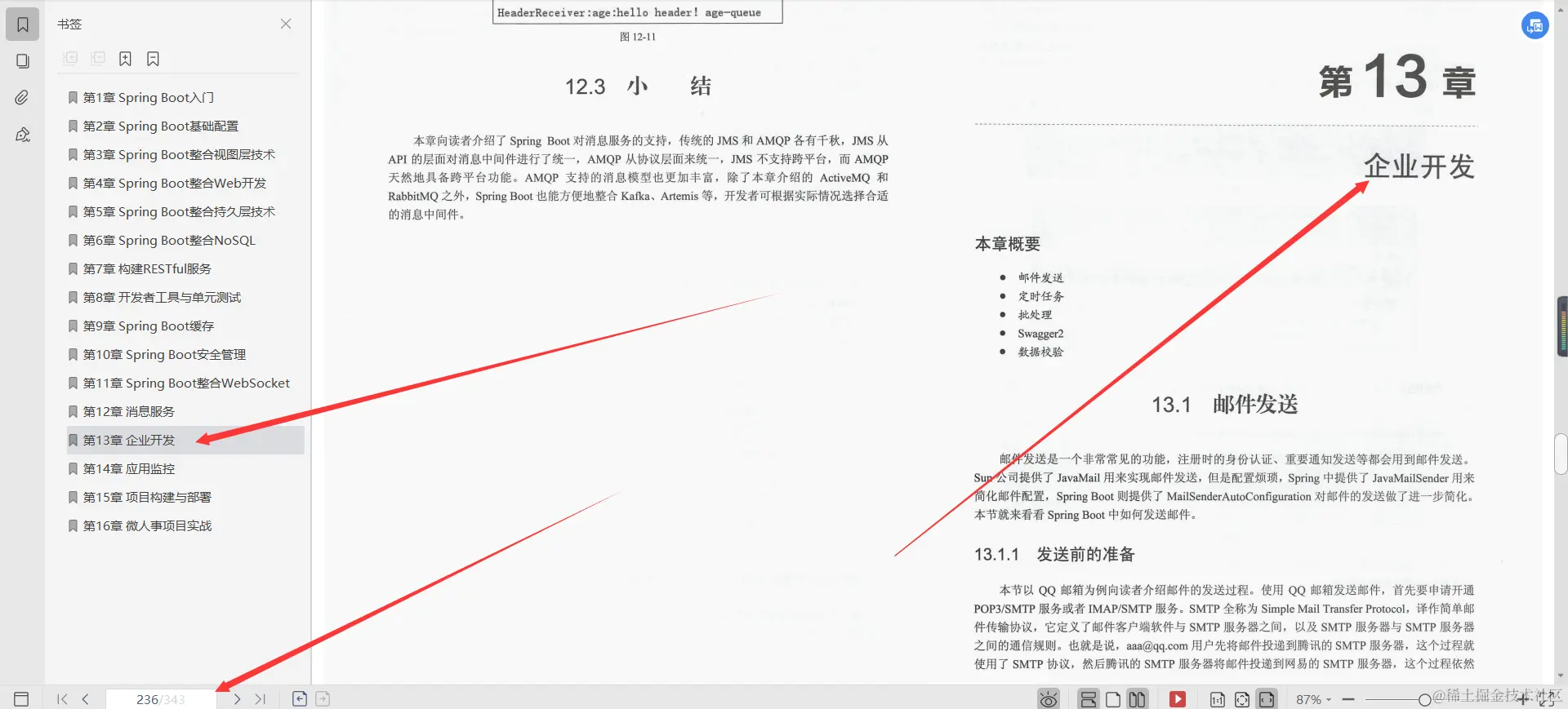 第13章企业开发, 本章向读者介绍了企业开发中一些常用的功能,如邮件发送、定时任务、批处理、Swagger 2以及数据校验,这些功能都有非常广泛的使用场景,如用户注册、修改密码、定时备份、接口文档等,除了Swagger2外,其他4个功能在Spring Boot中都提供了相关的Starter,简化了开发者的使用步骤,提高了开发效率。