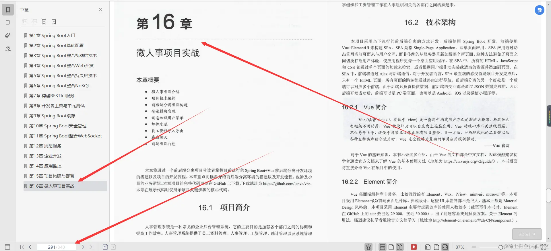 第16章微人事项目实战, 本章向读者介绍了一个微人事项目,主要从登录模块、动态加载用户菜单、员工资料模块、邮件发送模块、Excel导入导出模块、在线聊天模块以及编译打包几个方面介绍。由于原项目代码量庞大,本章主要选取一些关键步骤进行介绍,完整代码读者可以在GitHub上下载,下载地址为。。