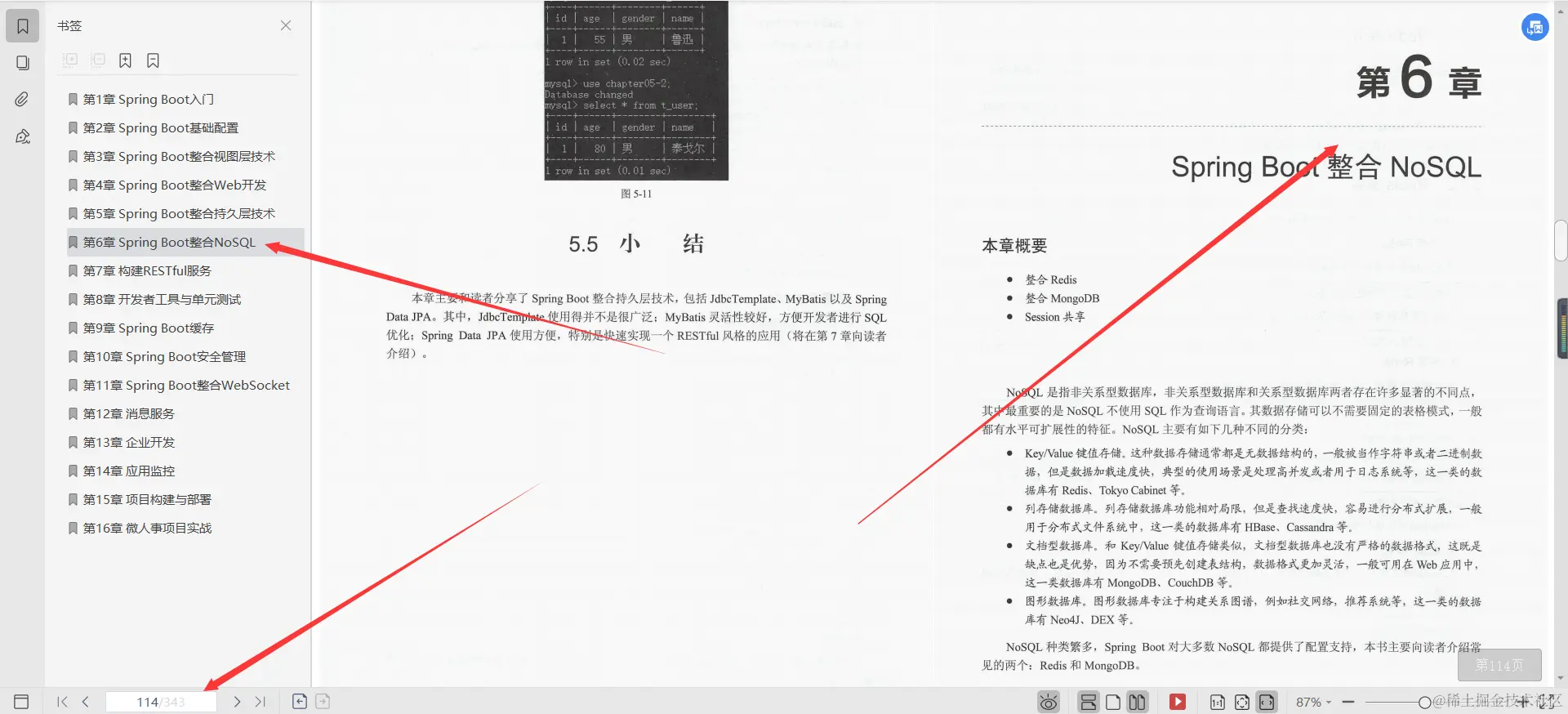 第6章Spring Boot整合NoSQL, 本章主要向读者介绍了Spring Boot整合NoSQL数据库以及结合Redis实现Session共享。对于NoSQL数据库,介绍了比较常见的两种:MongoDB和Redis。MongoDB在一些场景中甚至可以完全替代关系型数据库,Redis更多的使用场景则是作为缓存服务器(本书第9章将详细介绍Redis缓存),开发者可根据具体情况选择合适的NoSQL。