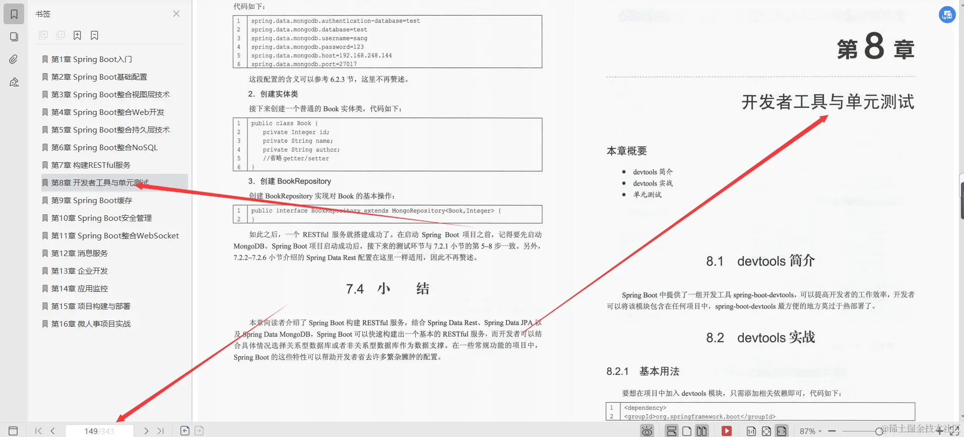 第8章开发者工具与单元测试, 本章向读者介绍了Spring Boot中的开发者工具和单元测试,开发者工具的一个核心功能就是热部署,结合LiveReload可以极大地缩短开发者等待编译的时间,有效提高开发效率;单元测试则与Spring 单元测试一脉相承,但是又增加了许多功能,同时简化了测试代码,使开发者极大地节省了测试的编码时间。本章对于单元测试只是介绍了一些常用功能,如果读者想了解完整的单元测试功能,可以参考Spring Boot官方文档单元测试一节。