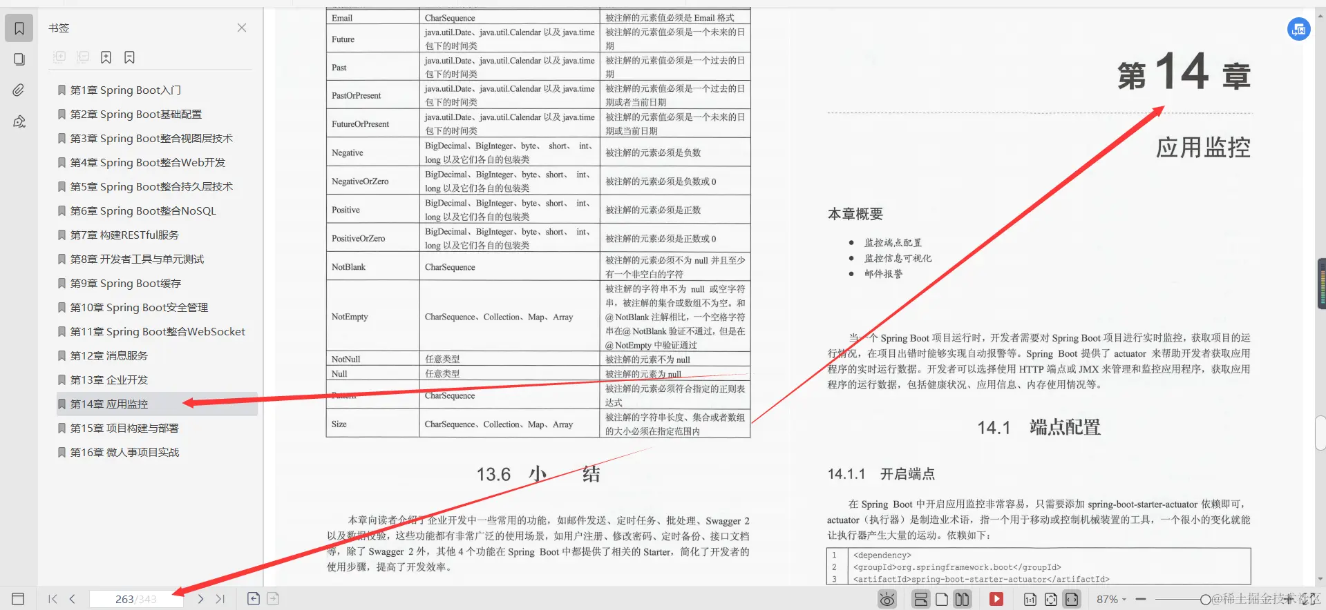 第14章应用监控, 本章向读者介绍了Spring Boot项目中常见的应用监控,分别介绍了端点的配置以及监控数据的可视化,Spring Boot提供的这一整套应用监控解决方案非常强大,在常规项目中稍微修改就可以直接用于生产环境了。邮件报警则可以使运维工程师及时获取应用的运行信息,特别是在应用程序下线时及时收到通知,尽早解决问题,避免造成损失。