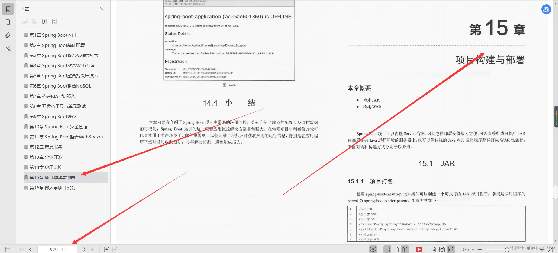 第15章项目构建与部署, 本章主要向读者介绍了Spring Boot项目不同的打包方式,开发者可以使用传统的WAR包部署,也可以使用Spring Boot官方推荐的JAR包部署,两种部署方式各有优缺点,需要开发者根据实际情况选择合适的部署方式。