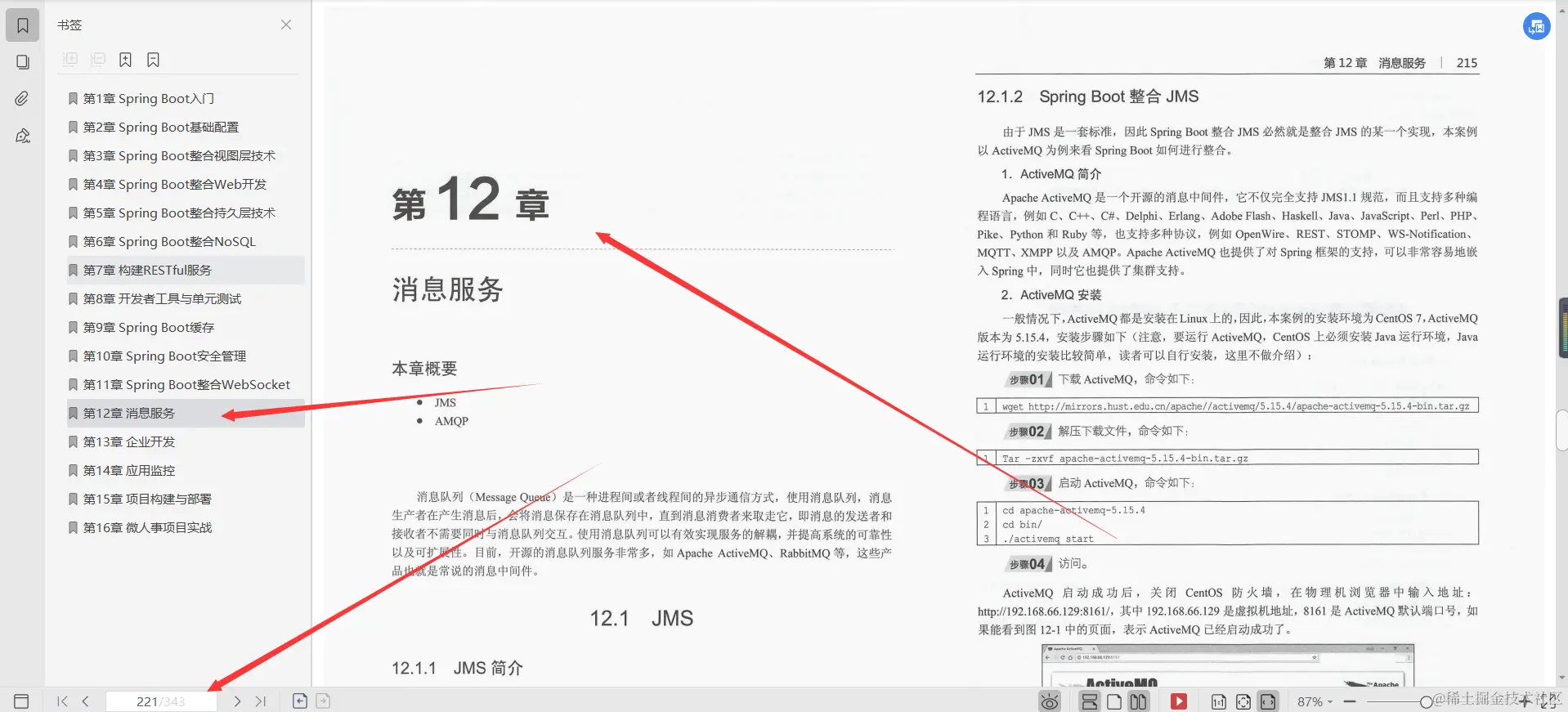 第12章消息服务, 本章向读者介绍了Spring Boot对消息服务的支持,传统的JMS和AMQP各有千秋,JMS从API的层面对消息中间件进行了统一,AMQP从协议层面来统一,JMS不支持跨平台,而AMQP天然地具备跨平台功能。AMQP支持的消息模型也更加丰富,除了本章介绍的ActiveMQ和RabbitMQ之外,Spring Boot也能方便地整合Kafka、Artemis等,开发者可根据实际情况选择合适的消息中间件。