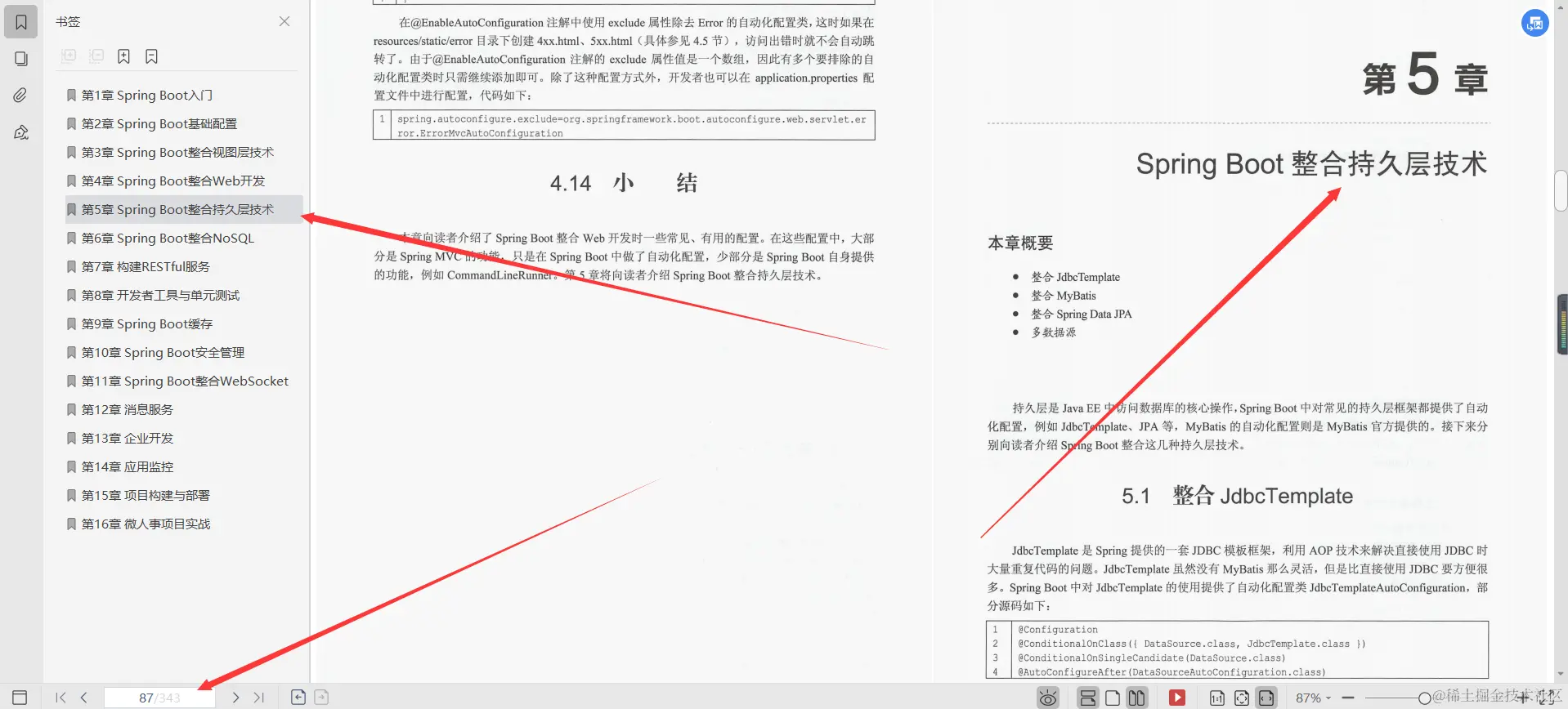 第4章Spring Boot整合Web开发, 本章向读者介绍了Spring Boot整合Web开发时一些常见、有用的配置。在这些配置中,大部分是Spring MVC的功能,只是在Spring Boot中做了自动化配置,少部分是Spring Boot自身提供的功能,例如CommandLineRunner。第5章将向读者介绍Spring Boot整合持久层技术。