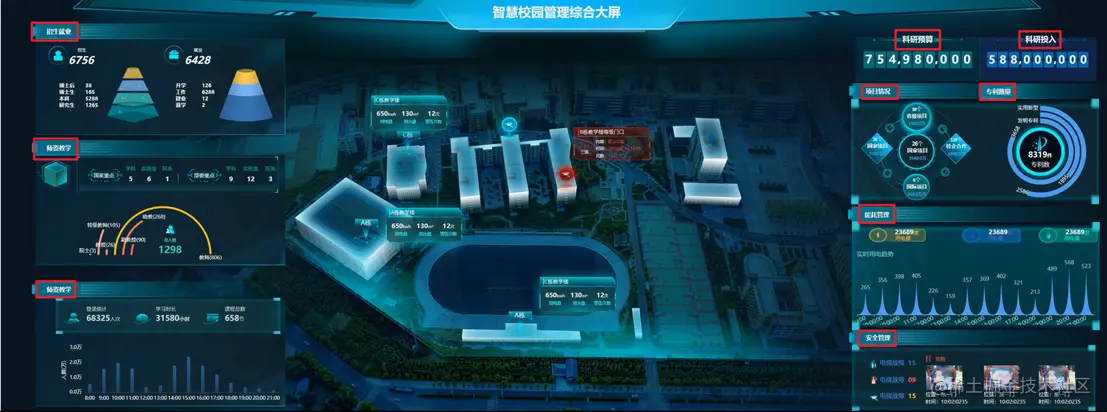 2、确定物理大屏尺寸,明确设计稿的尺寸 看板设计好后均是要在大屏上进行展示,所以要提前确定好对应的物理大屏尺寸,这样设计出来的大屏才能获得最好的视觉体验,也会展示的更加完美。注意:若物流大屏分辨率过高时,可以采用分辨率减半的设计方法去进行设计。 3、确定大屏展示的关键指标 确定好大屏尺寸后,就需要确定大屏展示的关键指标内容,那什么是关键指标呢?一般情况下,为了数据显眼,我们通常会将对应的特别数据独占看板的一块区域,这个区域的数据就是关键指标。所以通过对关键指标的理解,我们就会知道大屏上有几个区域,以及对应的区域内容是什么,更容易理解这个大屏。 以下面这个智慧校园管理综合大屏为例,这里的关键指标是看板中间的自定义地图、招生就业、师资教学、科研预算、科研投入、项目情况、专利数量、能耗管理和安全管理这几方面。