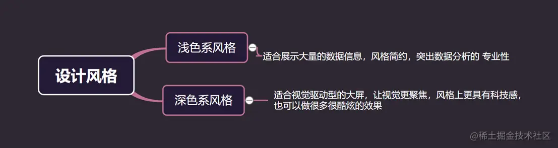 6、确定大屏的设计风格 大屏的设计风格需要依旧对应的行业类型、指标数据、客户需求等进行整体搭配,总体分为两种风格: