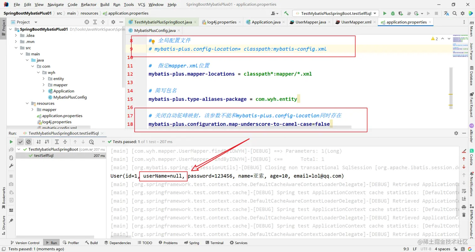 为了方便测试 我们先注释掉一个 来验证关闭自动驼峰映射 发现userName没有数据,因为没有被映射到
