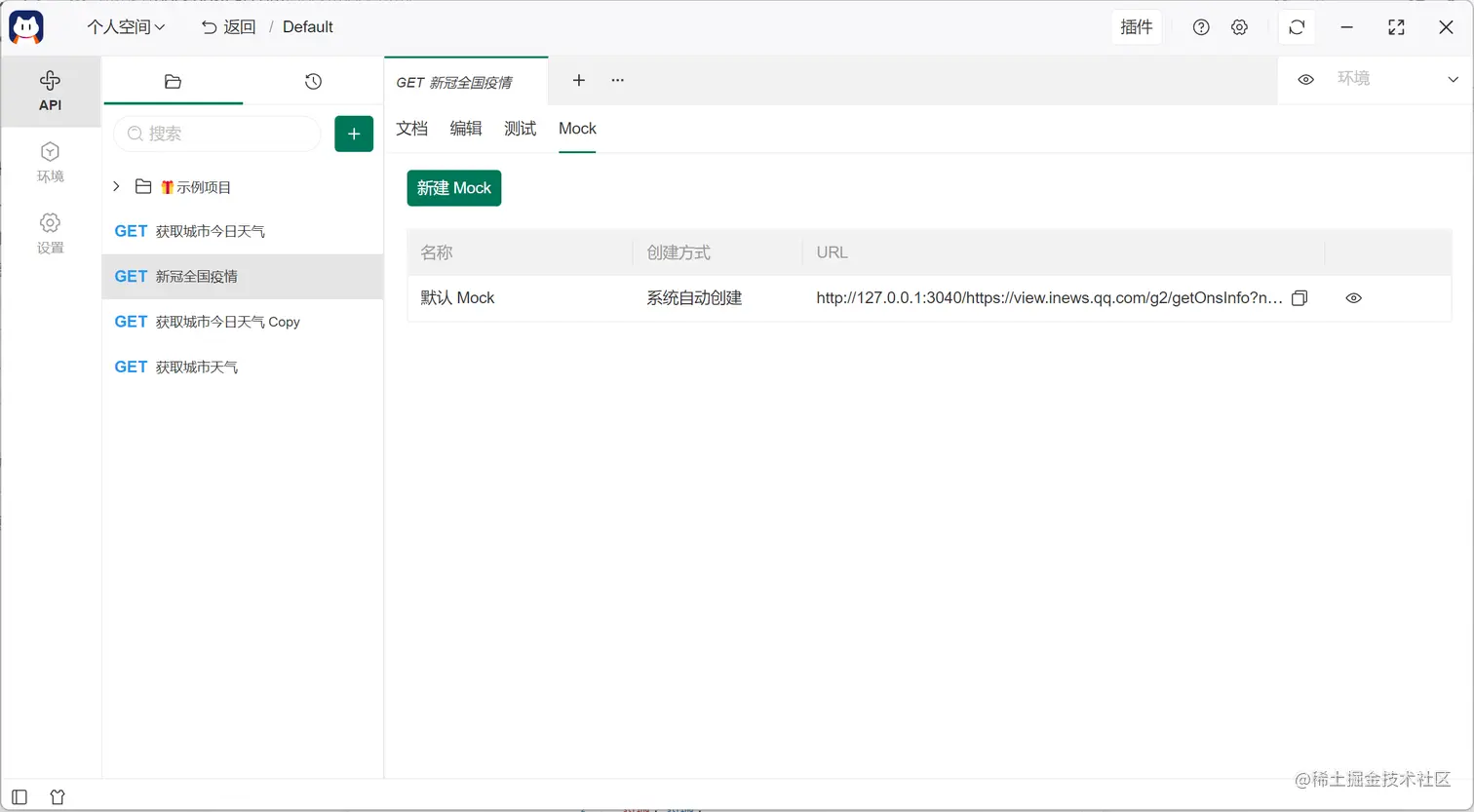 进入 Mock 列表页面,点击调用地址即可复制到剪贴板,在代码中直接对该 API 地址发起请求即可得到响应结果。