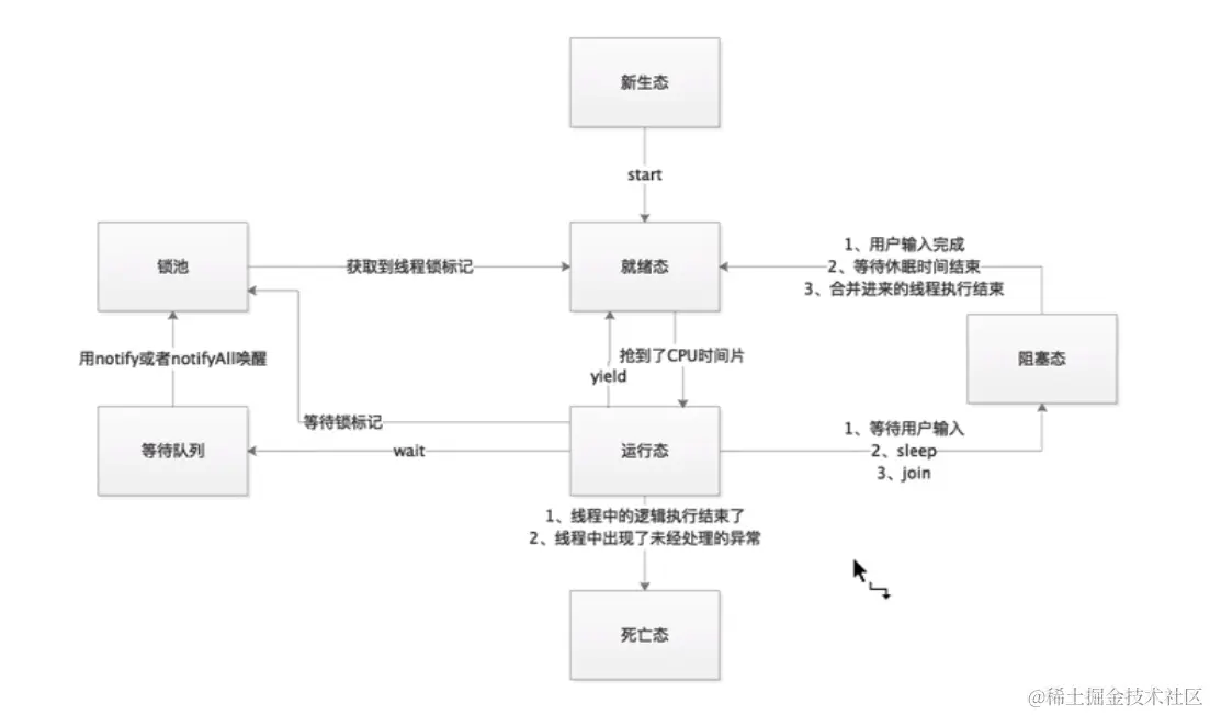 等待锁标记的意思就是有一个线程抢到了 cpu 时间片进入运行状态,获取到锁的拥有权,别的线程就进入到锁池状态,等到在运行状态的线程运行结束之后,锁池里面的线程争抢锁标记,谁抢到锁标记谁进入就绪状态。