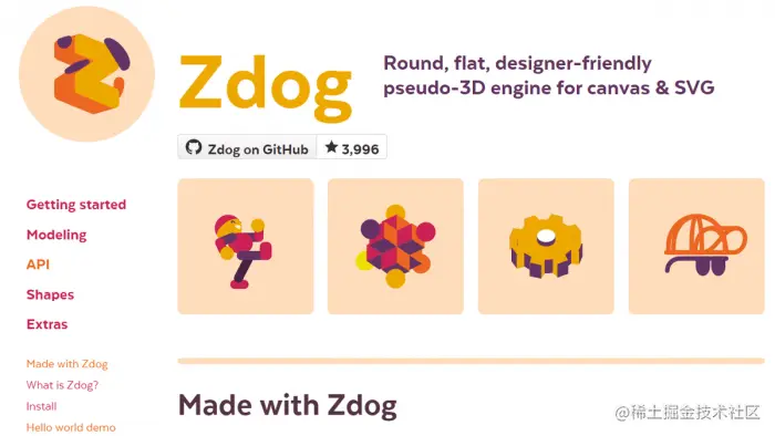 Zdog是一个用于画布和SVG的3D JavaScript引擎。Zdog是一个伪3D引擎,其中几何体以3D形式存在,但呈现为平面形状。