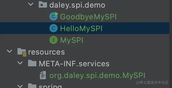首先提供了两个实现类 GoodbyeMySPI 和 HelloMySPI,然后在 META-INF/services 文件夹下保存了文件org.daley.spi.demo.MySPI,文件的内容是两个实现类的全路径名。就绪之后就可以在main方法中启动demo,用ServiceLoader.load()加载 MySPI 的两个实现类,然后分别调用接口方法执行。代码如下: