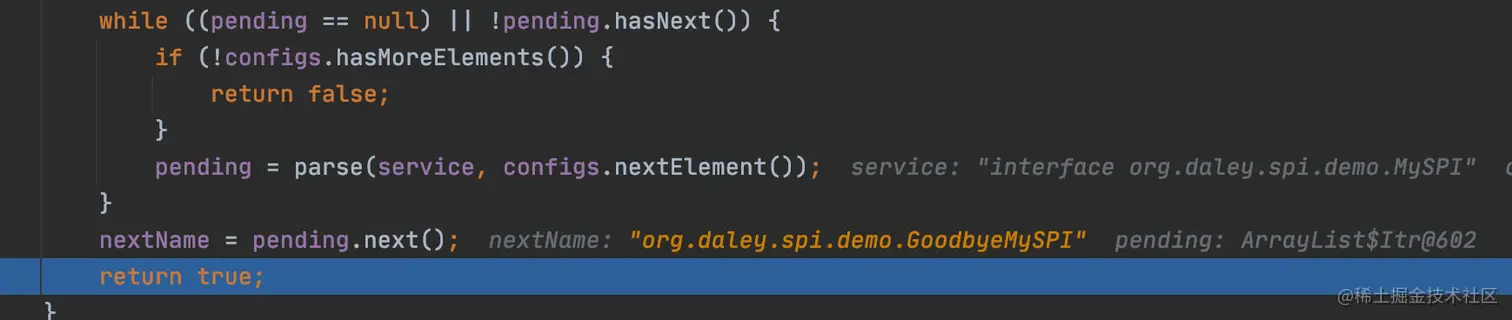 正如其名懒加载迭代器,在调用iterator.hasNext()时才真正发生加载。在hasNextService()方法中,第一次调用此方法会先拼接出配置SPI的文件名,在本demo中也就是META-INF/services/org.daley.spi.demo.MySPI,然后会使用类加载器加载配置文件并且将每行的内容设置到迭代器pending中,每次遍历都可以按行依次拿到实现类的名字。