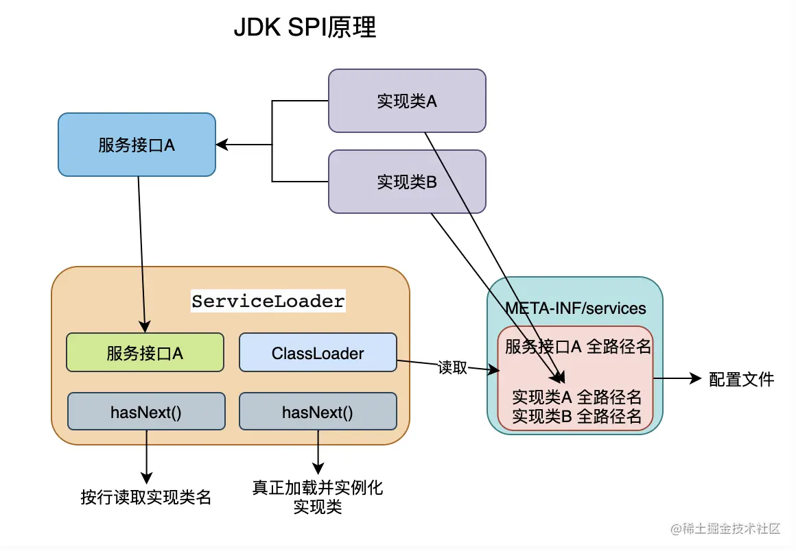 - 做好以上配置,就可以利用JDK SPI的查找机制在META-INF/services/文件夹下根据配置来对具体的实现类加载和实例化。
