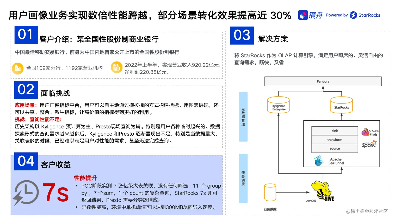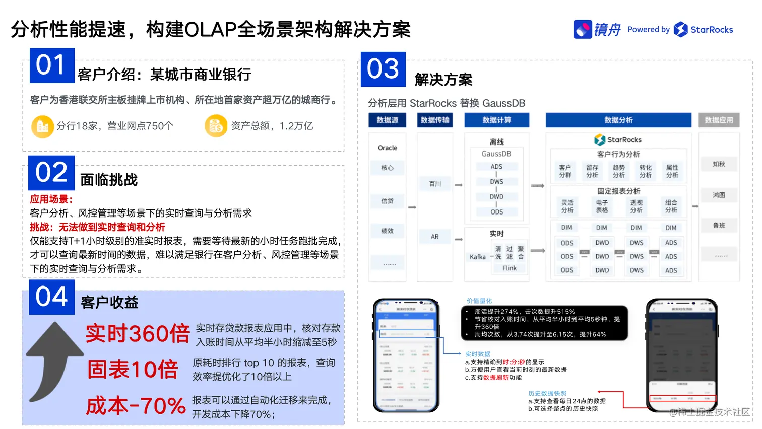 在某城市商业银行的案例实践中,该银行原有的数据平台仅能支持 T+1 小时级别的准实时报表,需要等待最新的小时任务跑批完成,才可以查询最新时间的数据,难以满足银行在客户分析、风控管理等场景下的实时查询与分析需求。于是,该银行借助StarRocks对数据分析架构进行改造升级,构建了全新的数据分析平台,极大提高了银行的数据导入、查询与分析效率: