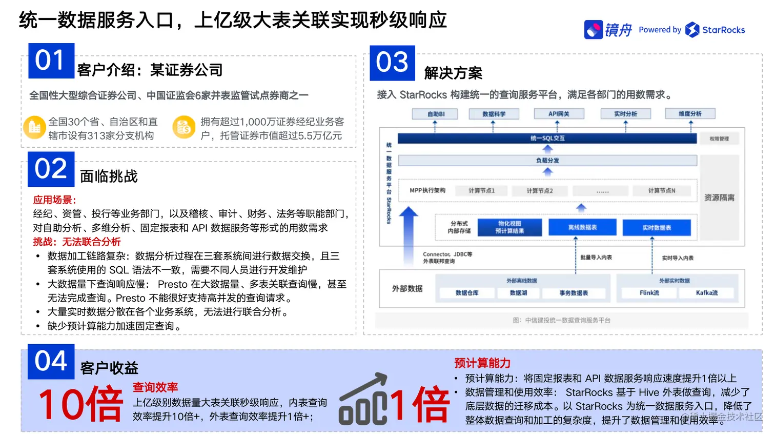 在某证券公司的案例实践中,之前,该公司总部和各分支机构,包括经纪、资管、投行等业务部门,以及稽核、审计、财务、法务等职能部门,对自助分析、多维分析、固定报表和 API 数据服务等形式的用数需求一直在不断增长,同时面临数据加工链路复杂、大数据量下性能不足,查询响应慢、大量实时数据分散在各个业务系统,无法进行联合分析、缺少预计算能力加速固定查询等痛点。