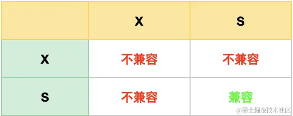- 当一个事务对一条记录加了 S 型记录锁后,其他事务也可以继续对该记录加 S 型记录锁(S 型与 S 锁兼容),但是不可以对该记录加 X 型记录锁(S 型与 X 锁不兼容);