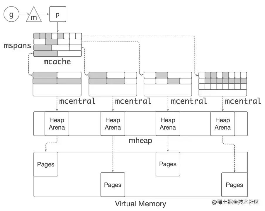 - Go 内存管理构成了多级缓存机制,从 OS 分配得的内存被内存管理回收后,也不会立刻归还给 OS,而是在 Go runtime 内部先缓存起来,从而避免频繁向 OS 申请内存。内存分配的路线图如下。