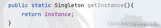 这个单例模式的名称是"饿汉模式",这个名字的来由是与后面的"懒汉模式"相比较得出的,体现在:在类加载阶段,就直接创建出了实例,实在很靠前的阶段给人一种急迫的感觉,所以叫饿汉模式