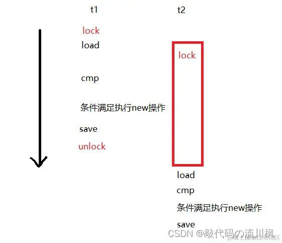 这种加锁方式是不可取的!!这里只给new操作加锁了,那么t2还是可能读到t1没来得及写的数据,所以我们要给整个操作加锁! 保证读,比较,new,写这几个操作整体是原子的,正确的加锁方法如下