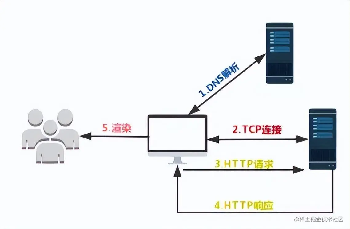 首先需要通过 DNS(域名解析系统)将 URL 解析为对应的 IP 地址,然后与这个 IP 地址确定的那台服务器建立起 TCP 网络连接,随后我们向服务端抛出 HTTP 请求,服务端处理完我们的请求之后,把目标数据放在 HTTP 响应里返回给客户端,拿到响应数据的浏览器就可以开始走一个渲染的流程。渲染完毕,页面便呈现给了用户。