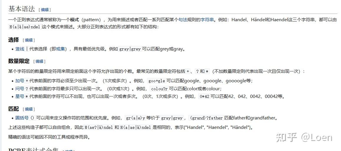 但这么强大的工具使用起来并不简单。想要熟练地掌握正则表达式需要掌握正则表达式的语法,而正则表达式的语法是比较抽象的。以下是来自维基百科的正则表达式的语法介绍: