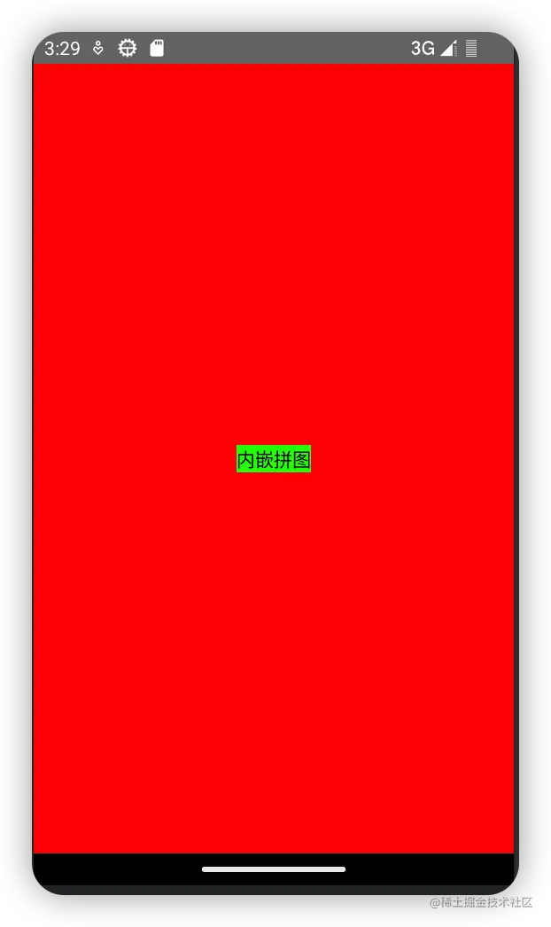 @Composable注释Puzzle1函数,把函数变成了可组合函数,也就是变成了一个拼图。Puzzle1拼图里面再放一个填充整个页面的Box红色背景的拼图,Box拼图里面再放一个居中绿色背景的Text拼图。到此这个拼图组合完毕,运行后页面显示如图: