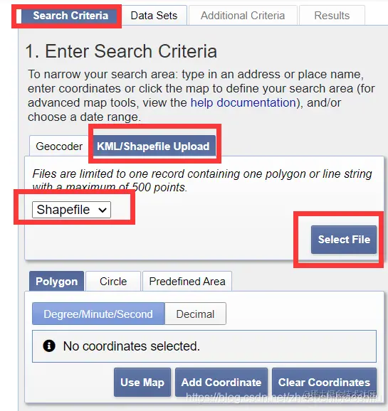 接下来,点击左侧“Search Criteria”,首先选择研究区域。研究区域的划定有多种方法,可以依据地理名称选定研究区域,也可以在右侧地图中手动划定研究区域,还可以上传自己的.kmz文件或Shapefile文件等等。例如,如果大家需要上传自己划定的Shapefile文件,就可以按照以下方法加以操作。