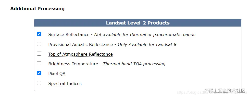 “Additional Processing”依据大家的实际情况加以选择,我这里选择地表反射率与质量监测文件。