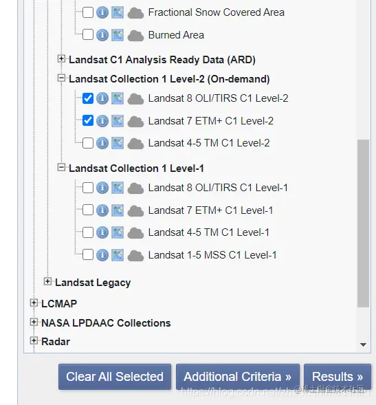 点击“Data Sets”,选择需要下载的遥感影像类型。本文中我们选择Landsat 7与Landsat 8两种类型。