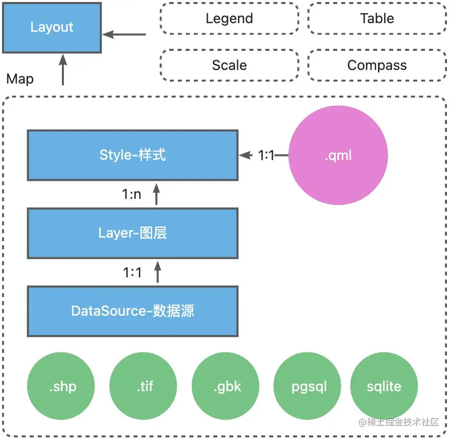QGIS对地理信息数据的组织方式基本上遵循如下分层,数据源这一层通过不同的类,用来屏蔽各种数据存储格式和数据类型的差异,无论是shpfile,还是数据库表,还是tif影像,通过相应的数据源处理类之后,都会变成Layer图层概念,图层加上样式就会呈现出我们看到的结果:蓝色的河流,网状的村庄,灰黑色的DEM数据等;其中一个数据源对应一个图层(一个图层只有一个数据源),一个图层可以有多种样式备选,但最终只能展现出一种样式,样式的信息最后都通过一个.qml文件格式的数据存储下来,最后以上这些东西组成了一个LayoutItemMap,这个LayoutItemMap加上其他的组件如LayoutItemLegend,LayoutItemTable,LayoutItemScale,LayoutItemCompass等等,组合成了制图成果打印所需要的Layout。