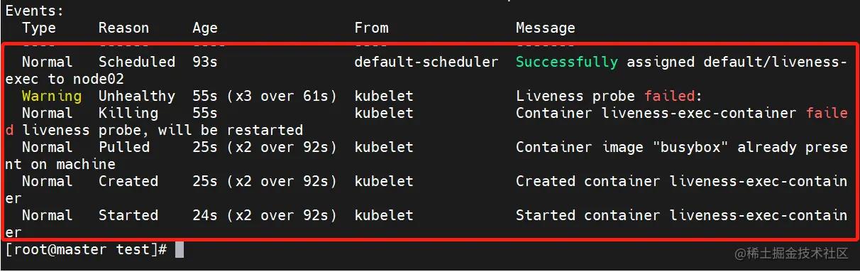 probe-tcp 1/1 Running 2 45s #第二次是 period(10秒) + period(10秒) 重试了两次