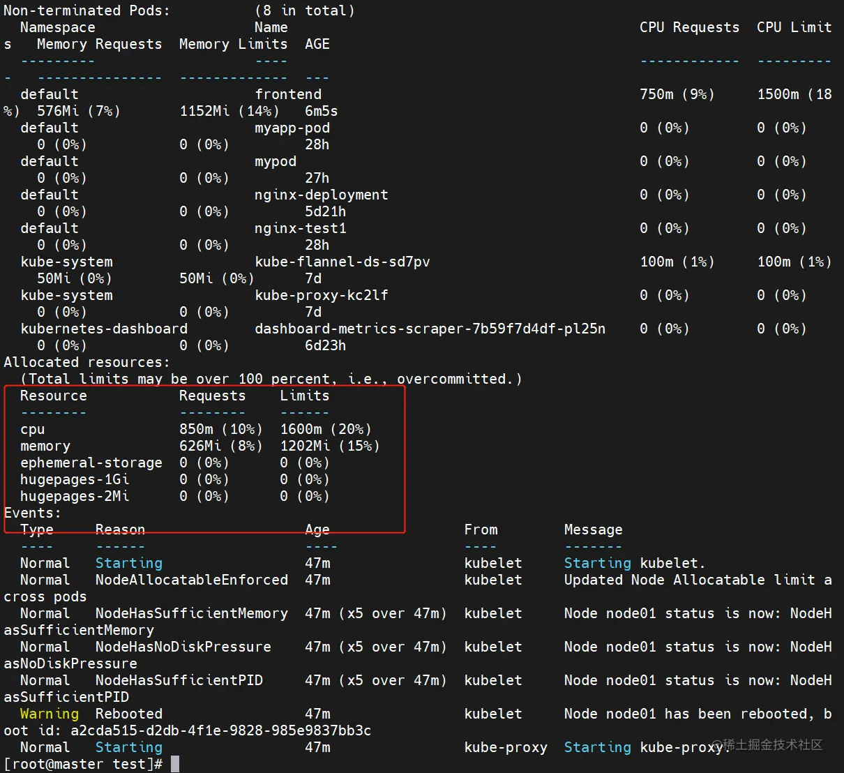 kubectl describe nodes node01 #由于当前虚拟机有2个CPU,所以Pod的CPU Limits一共占用了50%