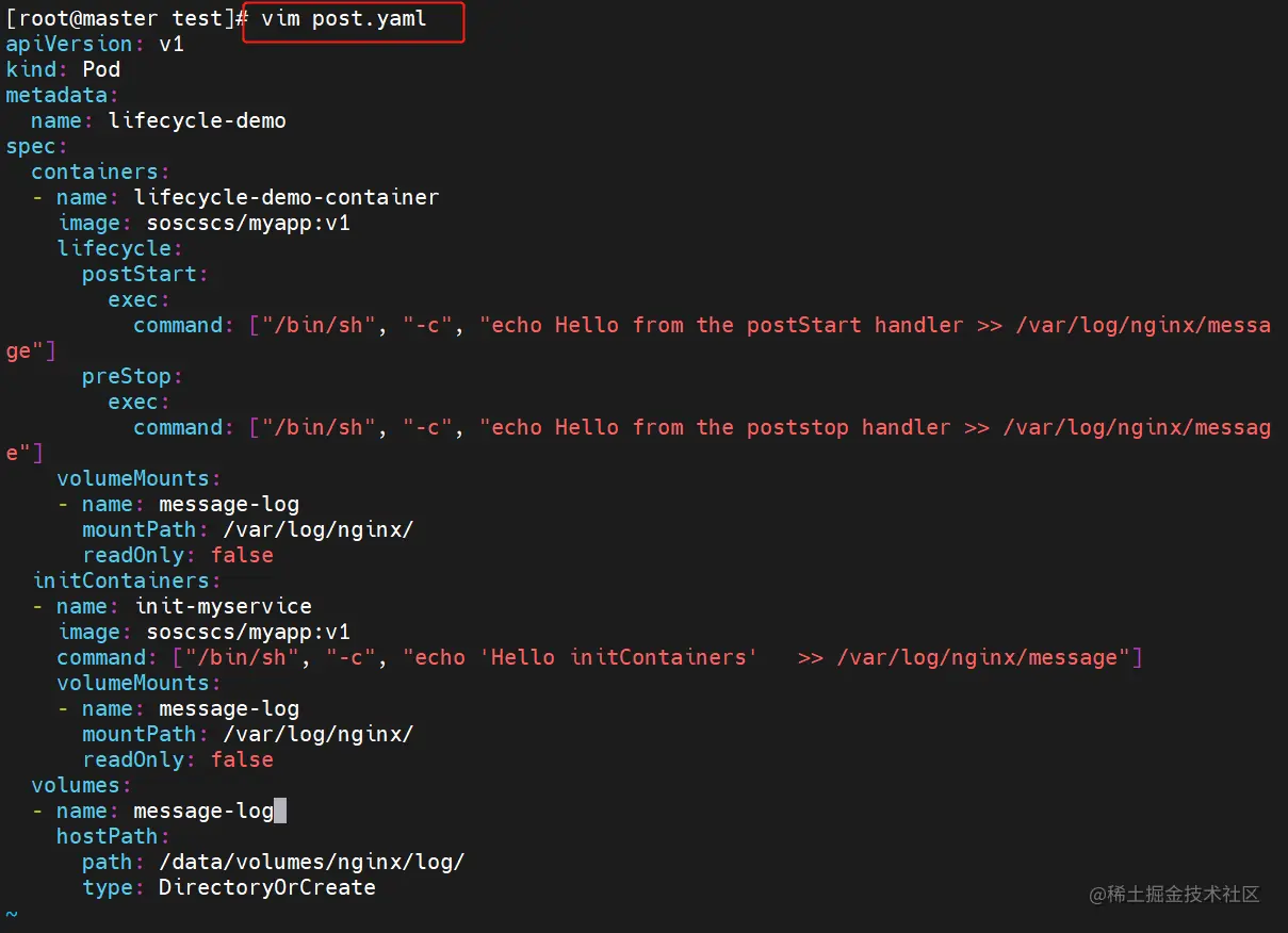 command: ["/bin/sh", "-c", "echo Hello from the postStart handler >> /var/log/nginx/message"]