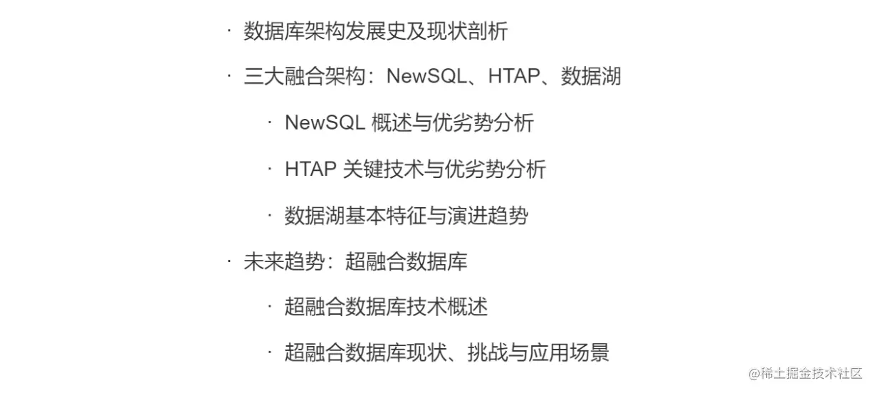 报告选取了三大当前盛行的两两融合的数据库架构——NewSQL、HTAP、数据湖,介绍其技术特性与优缺点。此处仅罗列简要观点,具体内容可查阅报告。
