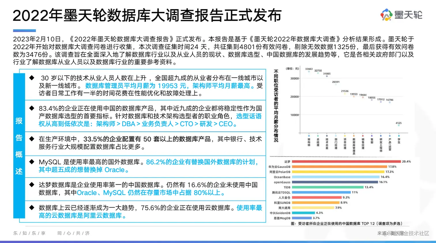 为了帮助大家及时了解中国数据库行业发展现状、梳理当前数据库市场环境和产品生态等情况,从2022年4月起,墨天轮社区行业分析研究团队出品将持续每月为大家推出最新《中国数据库行业分析报告》,持续传播数据技术知识、努力促进技术创新与行业生态发展,目前已更至第十期,并发布了共计127页的2022年度分析报告。