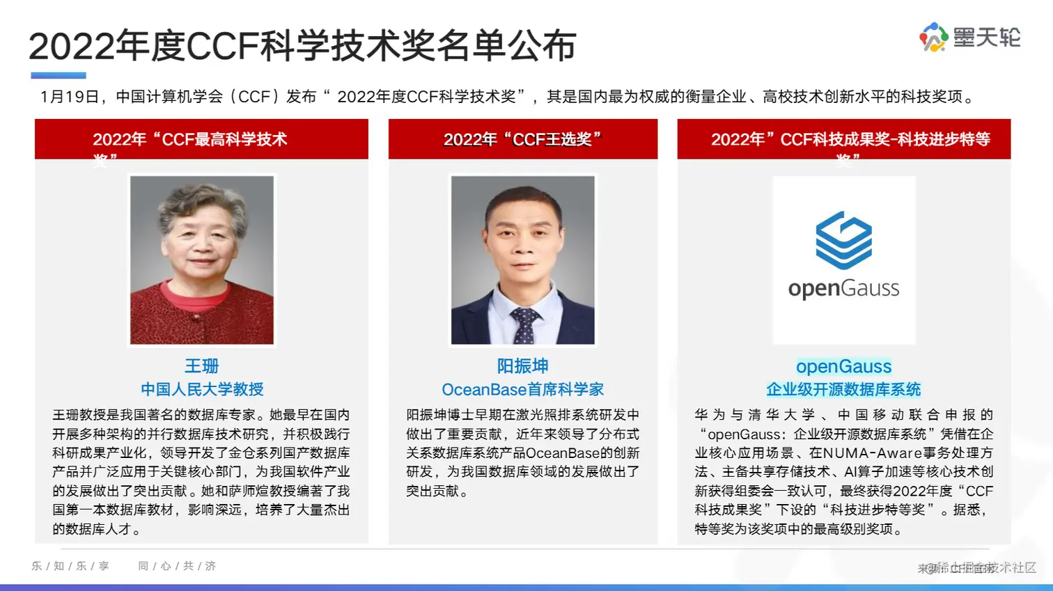 行业年度盘点层面,2023年1月起,墨天轮陆续发布了2022年度中国数据库墨力象限、2022年度数据库获奖名单,期望能够对2022年各产品的表现进行客观总结,并从多维度呈现出中国数据库产业发展的全貌。此外,《2022年墨天轮数据库大调查报告》已正式发布,该报告基于3476份有效问卷结果分析形成,旨在全面深入地了解数据库行业以及从业人员的现状、数据库选型、中国数据库的发展趋势等,是各相关政府部门以及行业了解数据库从业人员以及数据库行业的重要参考资料。1月19日,中国计算机学会(CCF)发布“ 2022年度CCF科学技术奖”,中国人民大学王珊教授、OceanBase首席科学家阳振坤以及openGauss分别荣获奖项。