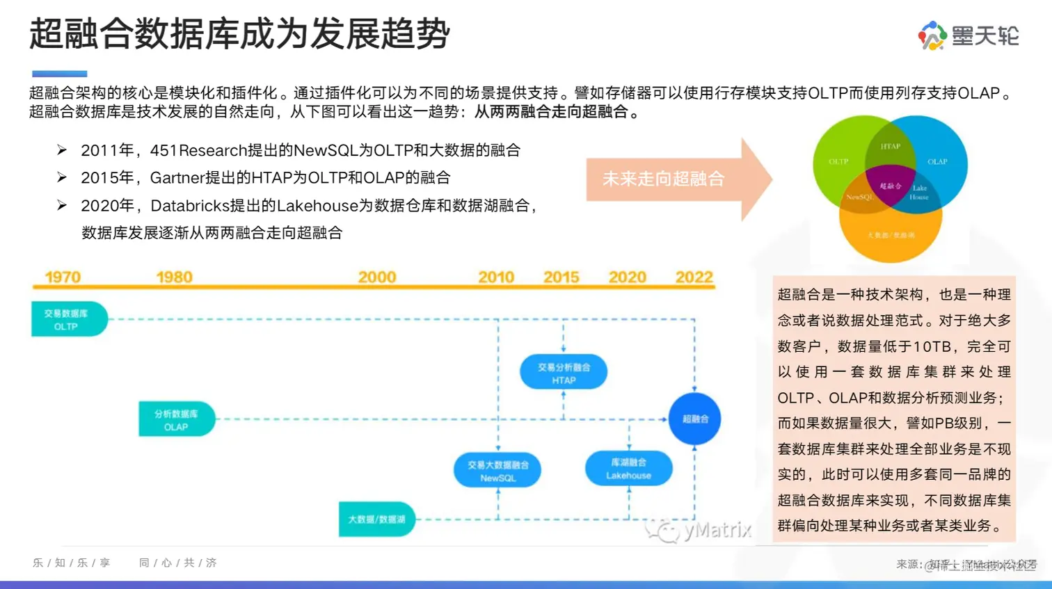 超融合架构的核心是模块化和插件化。通过插件化可以为不同的场景提供支持。譬如存储器可以使用行存模块支持OLTP而使用列存支持OLAP。超融合数据库是技术发展的自然走向,从下图可以看出这一趋势:从两两融合走向超融合。