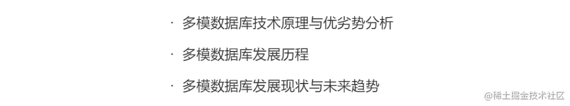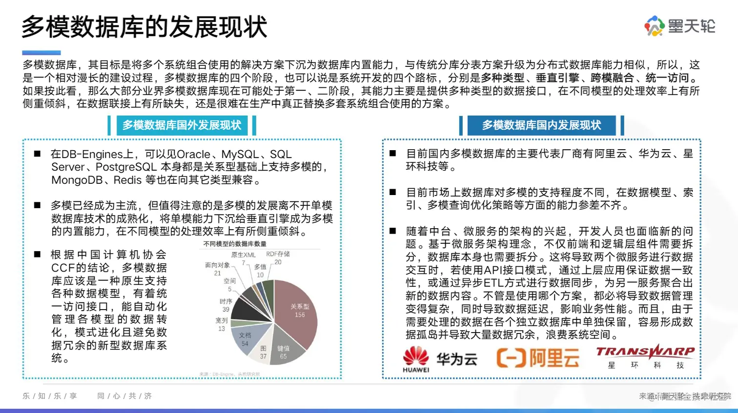 当前,围绕多种数据类型的存储与处理需求,业内也通过搭建涉及多种不同的数据库技术的混合架构来解决各种不同的数据问题。但是随着新基建的到来以及5G带来的应用爆发、数据爆发,可能会有更多模式的数据库种类出现,多模数据库则将成为业内一大研究发展趋势。本章节则围绕多模数据库的技术原理、发展背景以及优劣势等特征进行了论述,并总结其发展历程、国内外发展现状与发展趋势,望对业内研究发展提供参考。