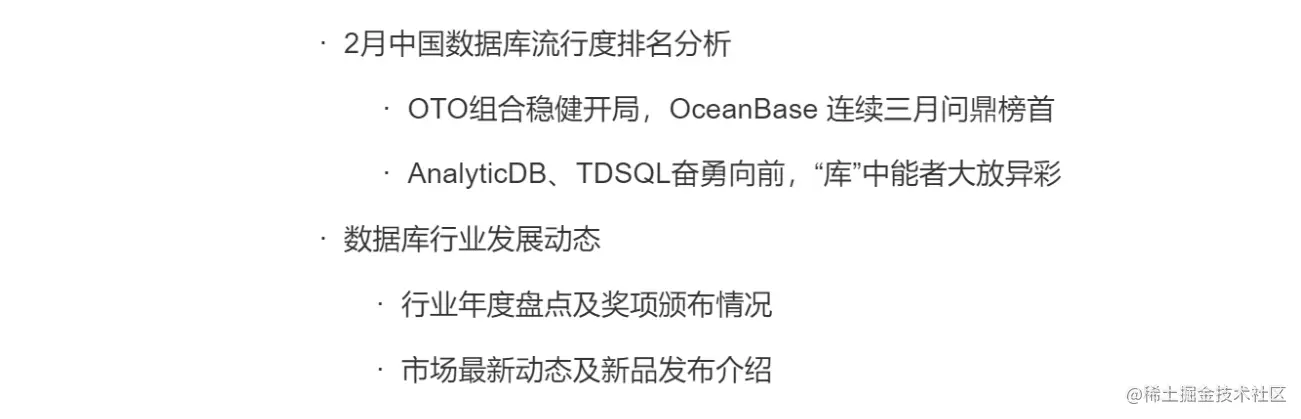 2月《中国数据库行业分析报告》已正式发布(点击即可跳转,欢迎大家下载查阅),本期报告盘点了墨天轮“中国数据库流行度排行”、产品发布、数据库中标等业内最新资讯,以此呈现当前数据库市场发展前沿动态。