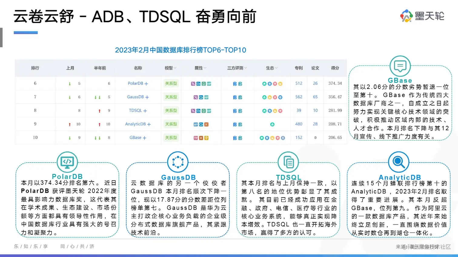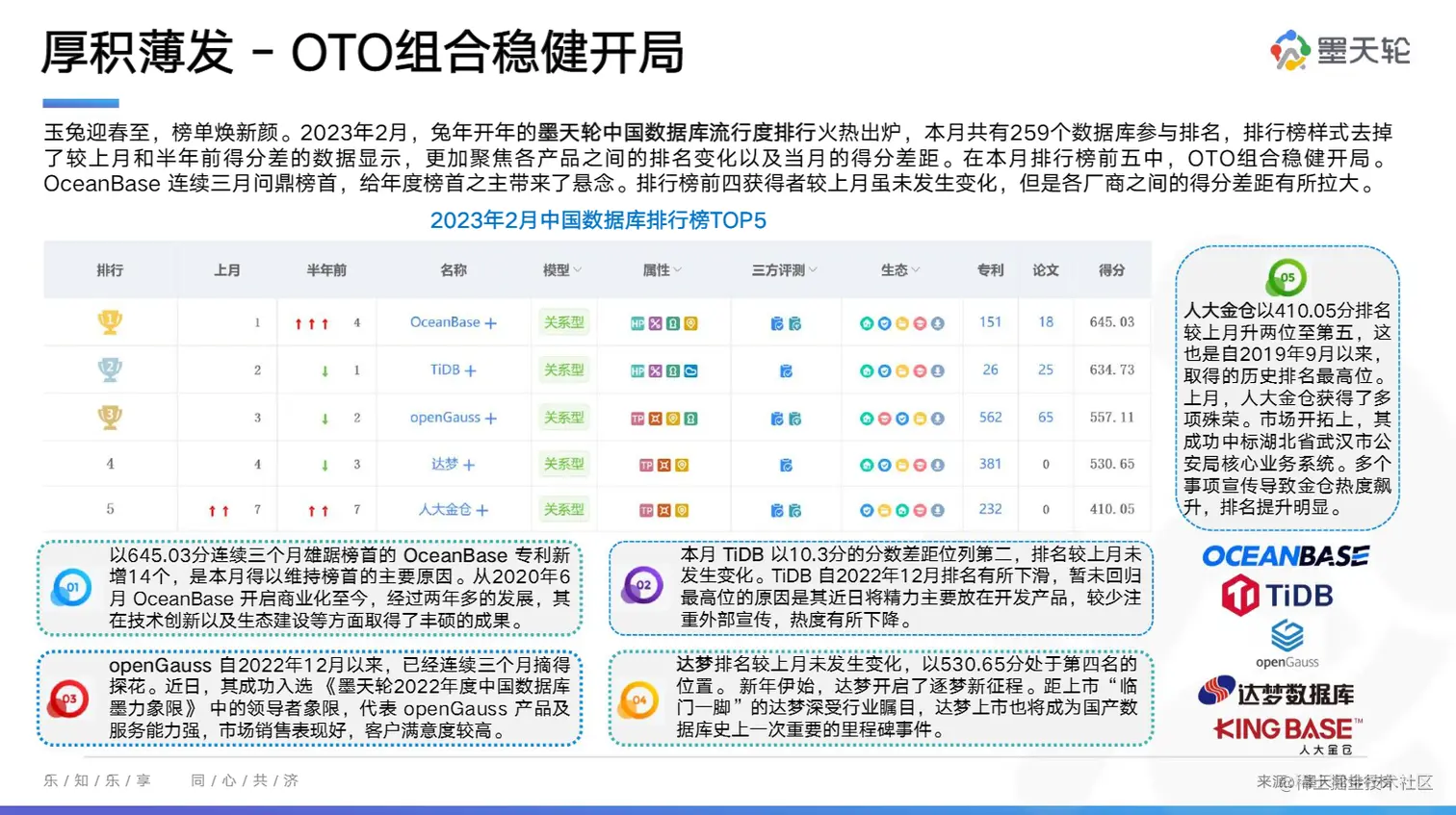2023年2月的墨天轮中国数据库流行度排行榜共259个数据库参与排名,榜单前十用一句话可以概括为:人大金仓上升两名排名有突破,AnalyticDB 进军榜单第九,OTO组合稳健开局。OceanBase 连续三月问鼎榜首,给年度榜首之主带来了悬念。排行榜前四获得者较上月虽未发生变化,但是各厂商之间的得分差距有所拉大,尤其是前三中第二名与第三名之间的得分差距达到了77.62分。此外,人大金仓、AnalyticDB 强势来袭,给后续榜单各产品的排名带来了更多可能性。