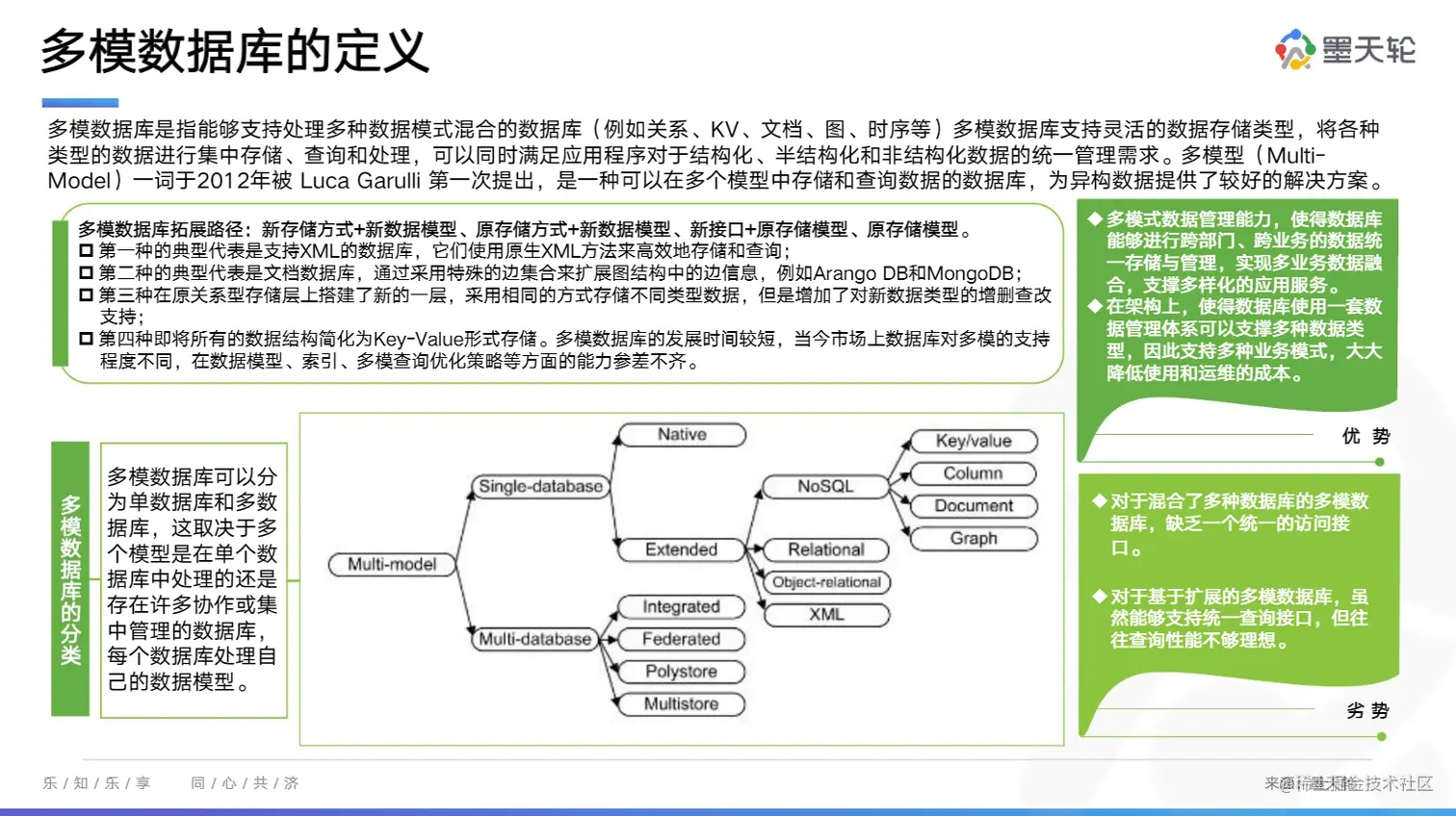 多模数据库是指能够支持处理多种数据模式混合的数据库(例如关系、KV、文档、图、时序等)多模数据库支持灵活的数据存储类型,将各种类型的数据进行集中存储、查询和处理,可以同时满足应用程序对于结构化、半结构化和非结构化数据的统一管理需求。未来多模数据库应该是一种原生支持各种数据模型,有着统一访问接口,能自动化管理各模型的数据转化,模式进化且避免数据冗余的新型数据库系统。未来,多模数据库可以从原子性、用于恢复和来源的故障弹性、遥感勘测、机器学习等四个方面发展。此处因篇幅所限仅展示部分观点,具体内容可查阅报告。