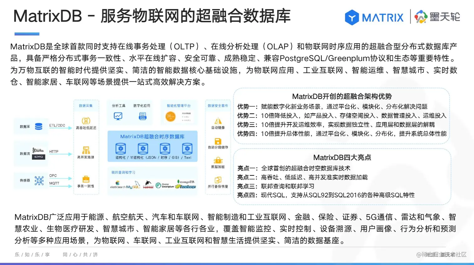 报告的最后选取了几款国内超融合数据库和多模数据库的案例进行了展示,诸如YMatrix发布的MatrixDB,其是全球首款同时支持OLTP、OLAP和物联网时序应用的超融合型分布式数据库产品;亚信科技发布的AntDB V7.2数据库,具备超融合一体化流式引擎能力,能够满足用户在 HTAP、湖仓一体、流式一体等多方面的混合负载需求;矩阵起源发布的超融合异构云原生数据库MatrixOne,可同时支持OLTP、OLAP和流式工作(Streaming)负载;云和恩墨在在openGauss内核基础上开发的超融合时序数据库Uqbar,同时支持关系模型和时序模型,是一款专为物联网场景设计的数据处理平台;星环科技自主研发的一站式分析型分布式多模数据库Transwarp ArgoDB,可以替代Hadoop+MPP混合架构;阿里云自研面向物联网、互联网、车联网等设计和优化的云原生多模超融合数据库Lindorm;华为云自研的全分布式架构多模NoSQL数据库GaussDB NoSQL,支持四种数据模型文档、宽列、时序。欢迎各位朋友查阅报告了解其实现原理与技术价值。此处仅展示其中几张内容,大家可以下载报告获取更多内容。