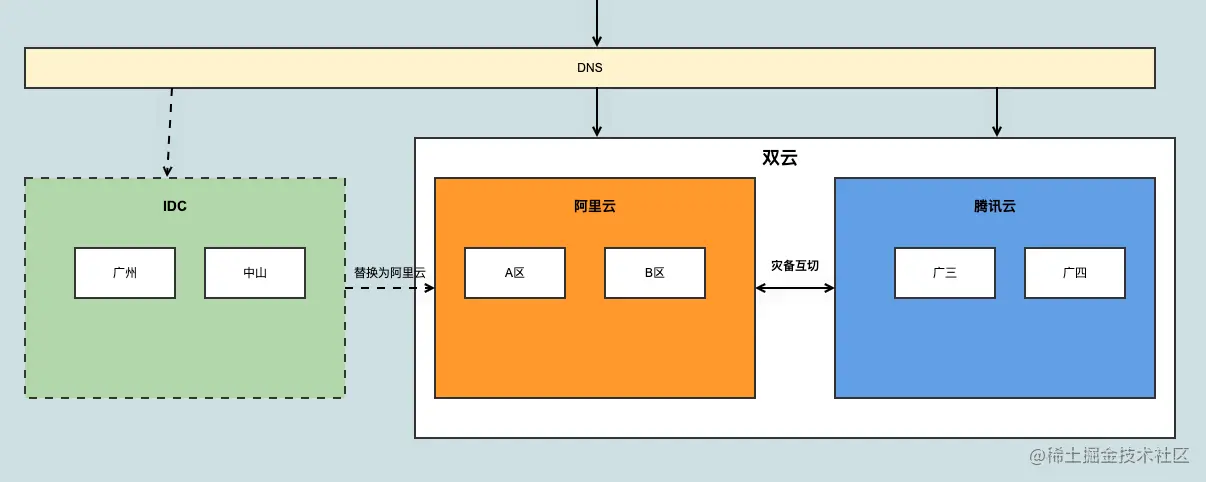 - 迁移计划的制定: 公司需要制定详细的迁移计划,以确保数据和应用程序能够平稳迁移到云上。迁移计划应该包括整体架构的设计,迁移的先后顺序,数据备份和恢复,以及测试和验证等等。这一点可以和云厂商派驻的专家团队一起制定。我们做了阿里云和腾讯云的双云容灾,所以整体架构采用了烟囱式的架构。